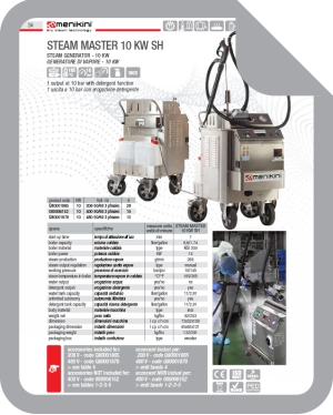 Steam Master 10 kW SH je industrijski parnik na suho paro z enim izhodom pare pri 10 bar in z dovodom detergenta. Delovanje temelji na nasičeni suhi pari, pri čemer je na voljo delovna temperatura pare v kotlu 185 °C, kar je namenjeno učinkovitemu odstranjevanju maščob, oblog in drugih trdovratnih nečistoč ter globinski sanifikaciji.