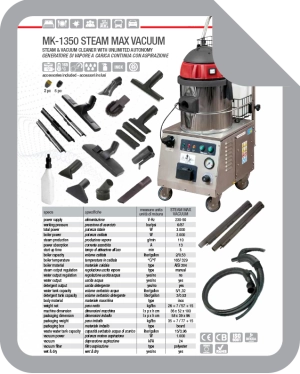 MK-1350 Steam Max Vacuum združuje suho paro in odsesavanje, zato je podprto čiščenje in sušenje površin v enem postopku. Delovanje poteka pri tlaku 6 bar, temperatura v kotlu doseže 165 °C, proizvodnja pare je 110 gramov na minuto.