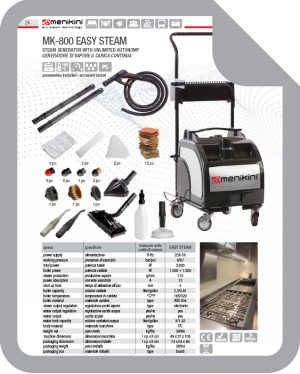 MK-800 Easy Steam je profesionalni parni čistilec z neomejeno avtonomijo, zasnovan za daljše čistilne cikle brez pogostih prekinitev. Delovanje poteka pri tlaku 6 bar, temperatura v kotlu doseže 165 °C, kar podpira učinkovito odstranjevanje nečistoč in sanifikacijo površin.